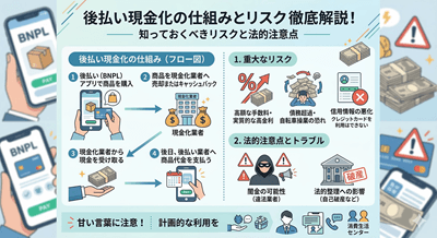 スマホやECサイトでの利用が急速に拡大している「後払い決済サービス」。この後払い決済の利用可能枠を、緊急で現金に換えたいと考える人が増え、「後払い現金化」という手法が注目されています。しかし、この仕組みは多くの法的・経済的リスクを伴います。本記事では、後払い現金化の具体的な仕組みと、利用者が必ず知っておくべき危険性について、客観的に詳しく解説します。
