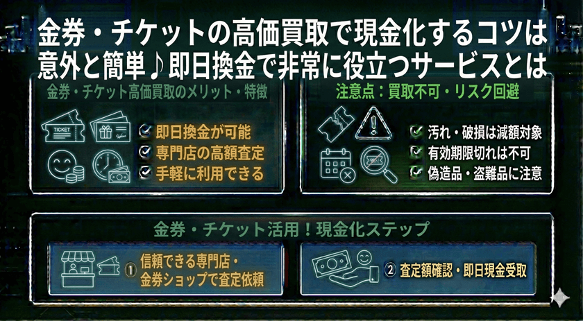 金券・チケットを現金化する際のメリットから、高価買取を狙うためのコツ、そして注意点まで、詳しく解説します。
